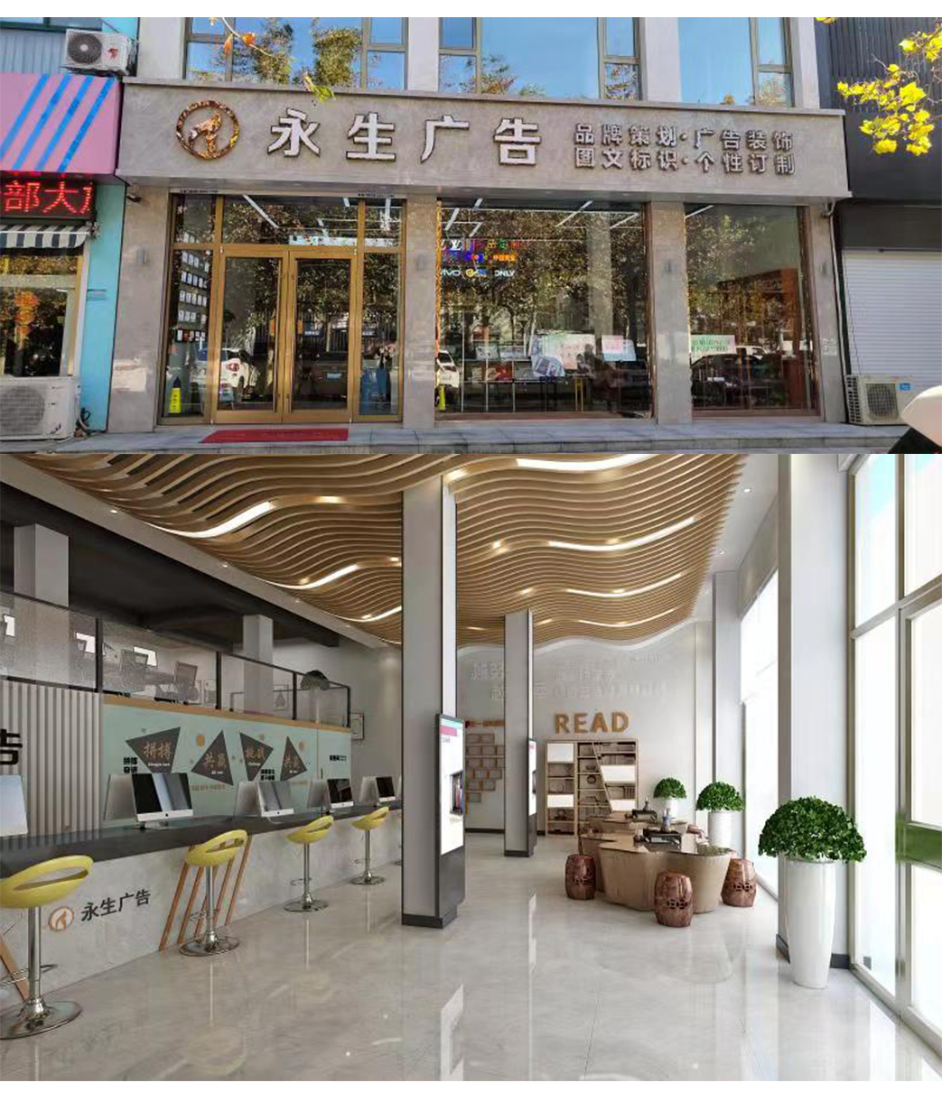 公司自有數(shù)碼沖床設(shè)備、500W光纖機(jī)、高精度大幅面噴繪機(jī)、寫真機(jī)、UV機(jī)、多種大小型雕刻機(jī)、吸塑機(jī)、全自動圍字機(jī)、自動開槽機(jī)、激光焊接機(jī)、拋光機(jī)等生產(chǎn)加工設(shè)備,擁有完善的設(shè)計(jì)團(tuán)隊(duì)、技術(shù)團(tuán)隊(duì)、施工團(tuán)隊(duì)、售后團(tuán)隊(duì),可為廣大客戶提供室內(nèi)裝修、店招門頭、精神堡壘、黨建標(biāo)識、標(biāo)識標(biāo)牌、宣傳欄、LED顯示屏、警示標(biāo)識、精品字、證卡胸牌、證書獎杯、燈箱、桌牌、定制禮品、展具、噴印等多種專業(yè)廣告服務(wù)...